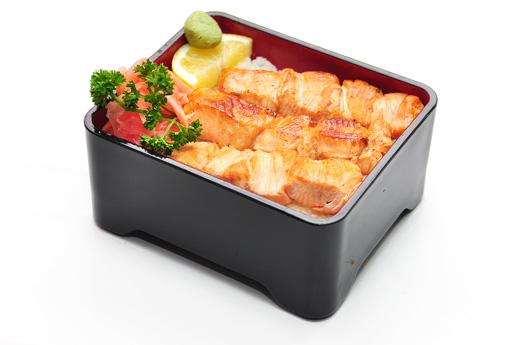 Soupe, salade, riz 6 sashimi saumon, 4 sushi saumon, 8 maki california saumon