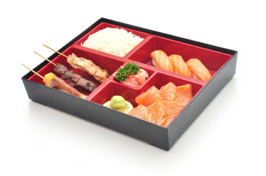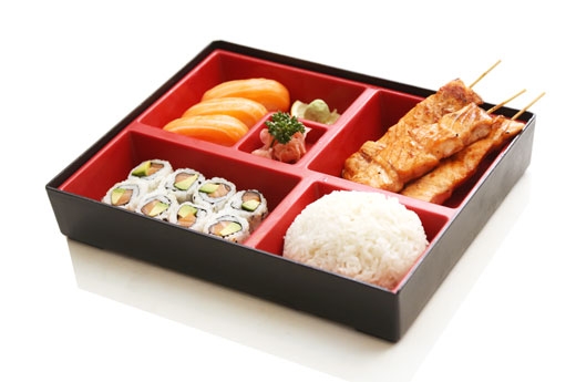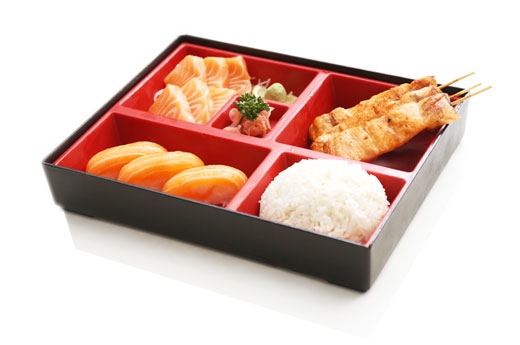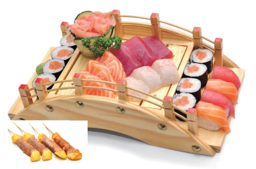 Soupe, salade, riz 2 sushi, 9 sashimi, 8 maki saumon 4 Brochettes: 1 poulet,1 boulette de poulet, 1 boeuf,1 boeuf au fromage