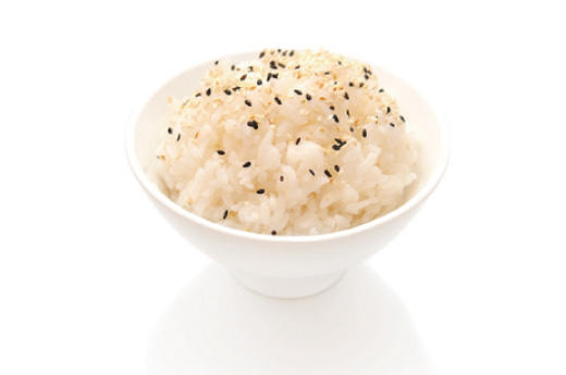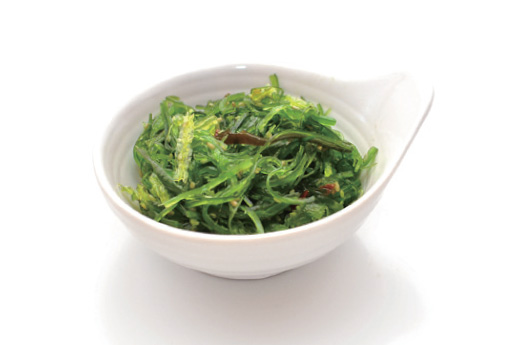 Poulet Sauté, salade d'algue, mangue, oignon frit, edamamé ,sur un riz vinaigré.