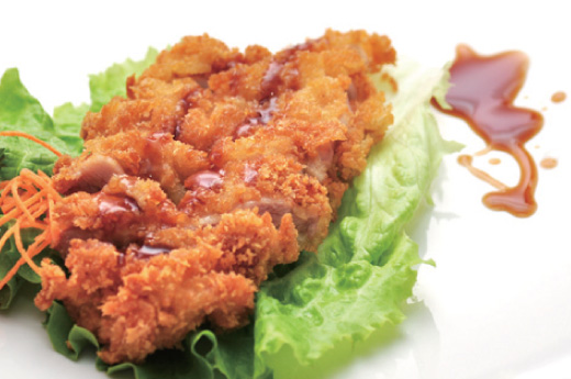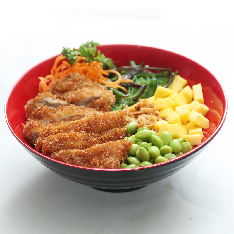 Poulet pané, salade d'algue, mangue, oignon frit, edamamé ,sur un riz vinaigré.