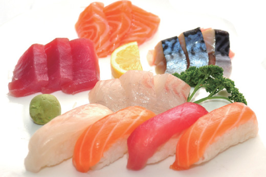 2 soupes, 2 salades, 2 riz 20 sashimi, 8 sushi, 8 maki california, 8 maki saumon