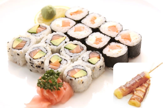 Soupe, salade, riz 8 Maki california saumon 4 Brochettes boeuf au fromage