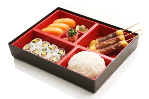 Soupe, salade, riz 8 California saumon, 3 sushi saumon, 3 brochettes : 1 poulet, 1 boeuf,1 boeuf au fromage