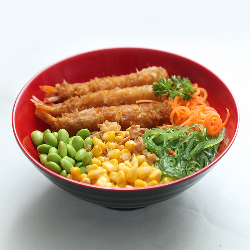 Tempura frit, salade d'algue, mangue, oignon frit, edamamé ,sur un riz vinaigré.