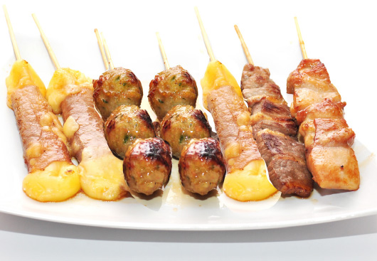 Soupe, salade, riz 7 Brochettes: 1 poulet, 1 boeuf, 2 boulette de poulet, 3 boeuf au fromage